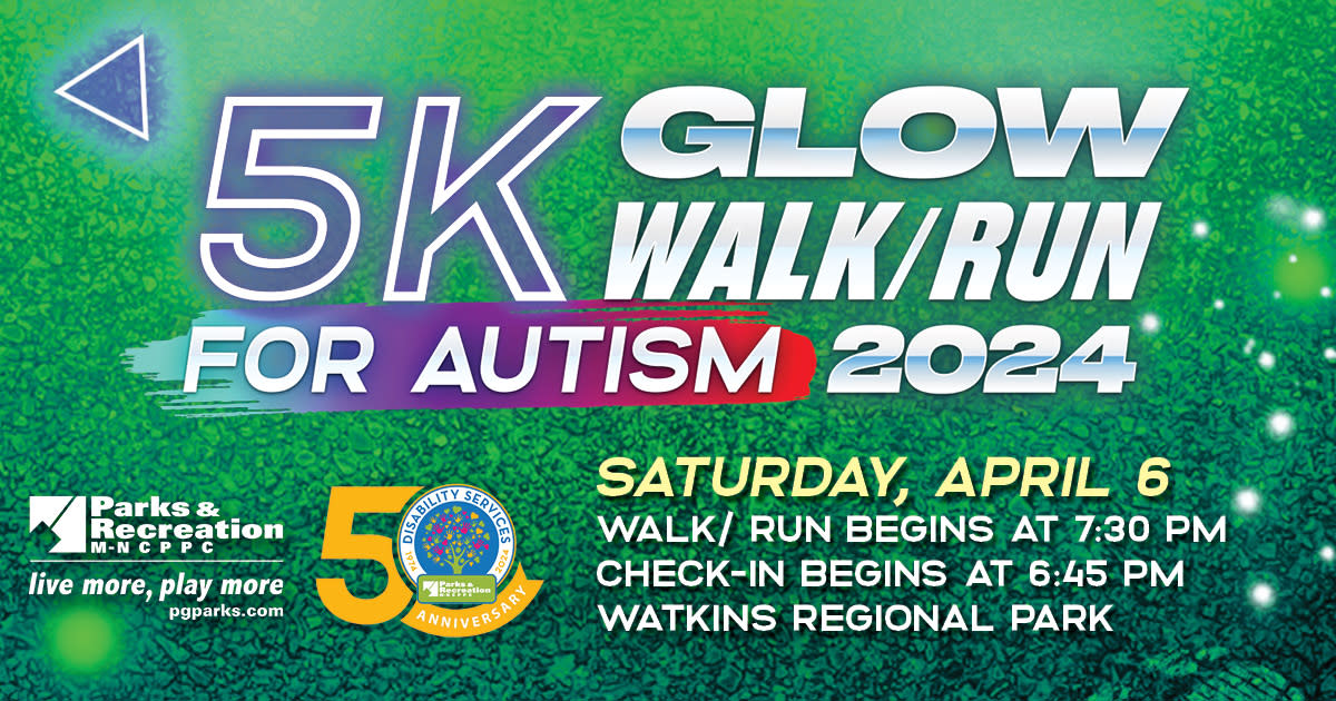 Aumenta la concienciación y la aceptación del autismo. Ven vestido con tu mejor ropa brillante para el 2024 Glow Walk / Run. Lo recaudado beneficia al Fondo de Becas YouFit, que ayuda a enviar a niños con autismo a los campamentos de verano de M-NCPPC.