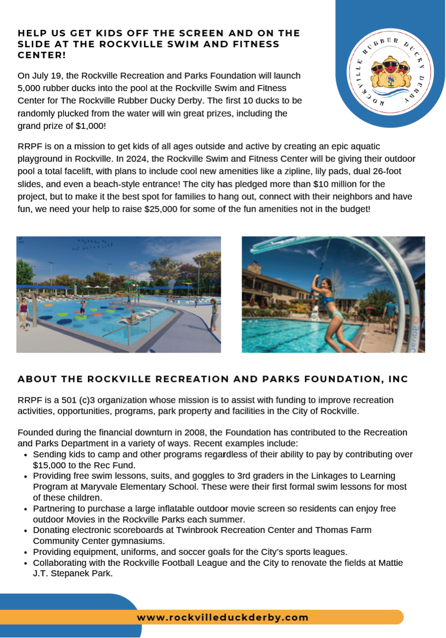 On July 19th, the Rockville Recreation and Parks Foundation will launch 5,000 rubber ducks into the pool at the Rockville Swim and Fitness Center for the "Rockville Duck Derby." The first 10 ducks to be randomly plucked from the water will win great prizes, including the grand prize of $1000!