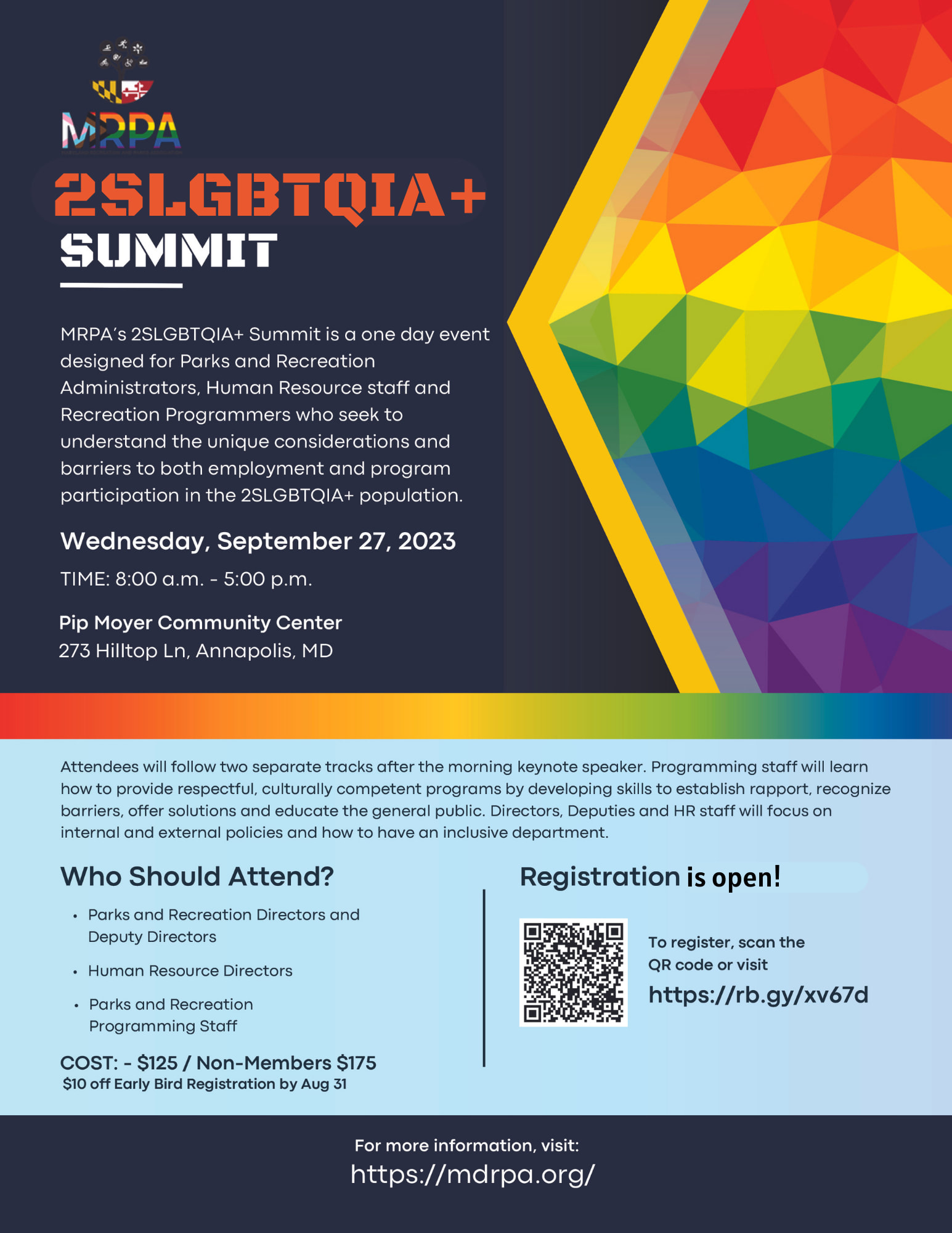 MRPA’s 2SLGBTQIA+ Summit is a one day event designed for parks and recreation administrators, Human Resource staff and recreation programmers who seek to understand the unique considerations and barriers to both employment and program participation in the 2SLGBTQIA+ population. Attendees will follow two separate tracks after the morning keynote speaker. Programming staff will learn how to provide respectful, culturally competent programs by developing skills to establish rapport, recognize barriers, offer solutions and educate the general public. Directors, Deputies and HR staff will focus on internal and external policies and how to have an inclusive department.